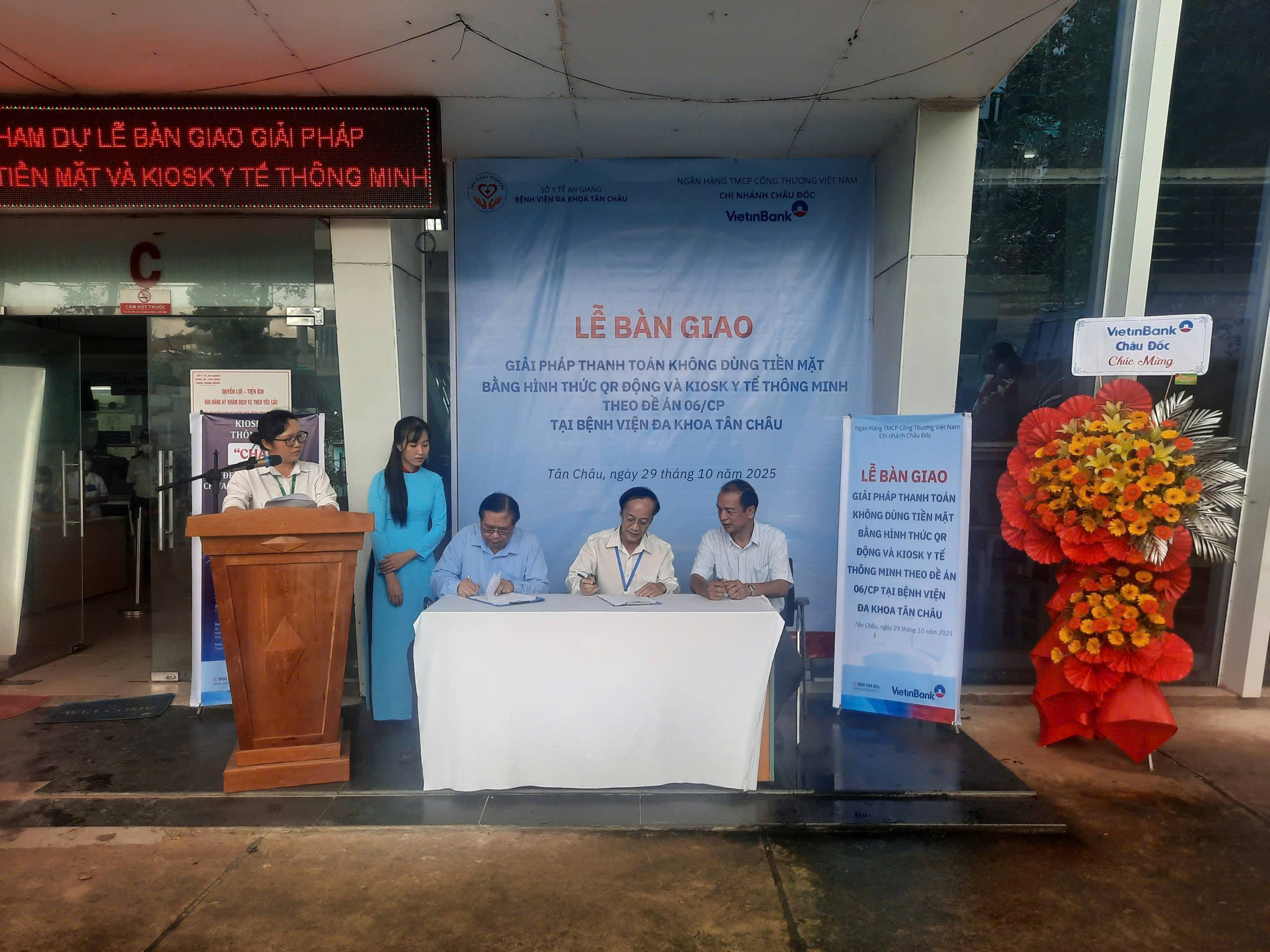 BÀN GIAO GIẢI PHÁP THANH TOÁN KHÔNG DÙNG TIỀN MẶT BẰNG HÌNH THỨC QR ĐỘNG VÀ KIOSK Y TẾ THÔNG MINH THEO ĐỀ ÁN 06/CP TẠI BỆNH VIỆN ĐA KHOA TÂN CHÂU.